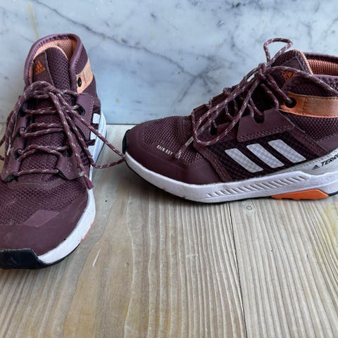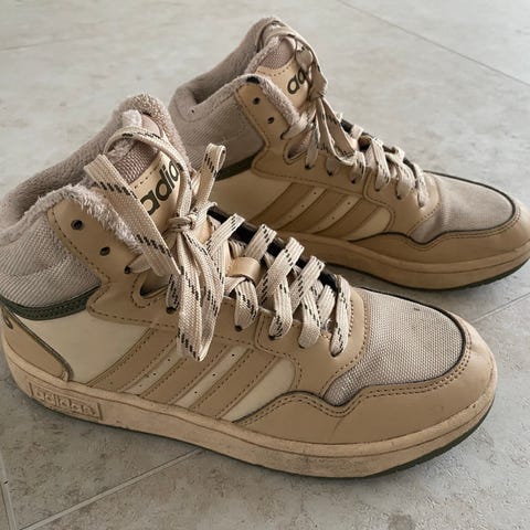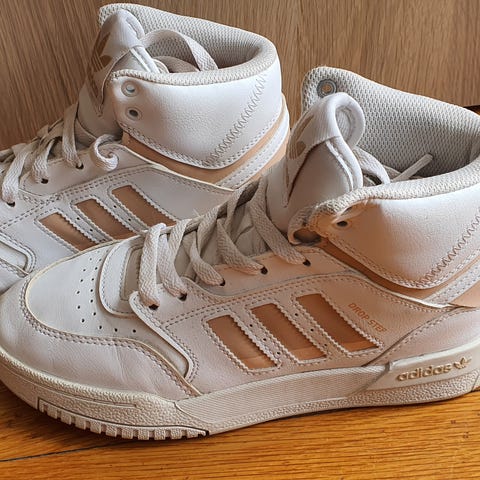 Brukt en gang inn og ut av bil,bare blitt stående siden de var litt forsmå.Var et lite hull i det svarte tøyet inni skoen,sikkert vært borti med noe på sko hyllen har sydd litt inni med ekstra sterk trå,då er ikke synlig hvis du ikke ser etter det.Veldig kule sko,fra merke Adidas str 37.1/3