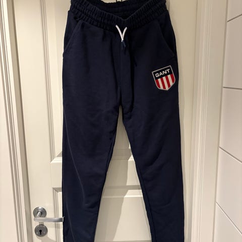 Tilnærmet ubrukt joggebukse i marineblå med logo på siden og snøring i livet. Dette er en smal modell i kraftig bomullsstoff av høy kvalitet som holder fasongen. Buksen er kjøpt på Tante Pose på CC Vest.