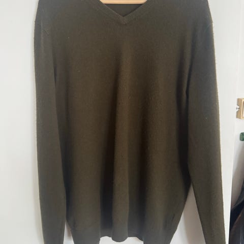 Selger en klassiker: v-hals vest i ren cashmere. Den er topp kvalitet fra Italia.