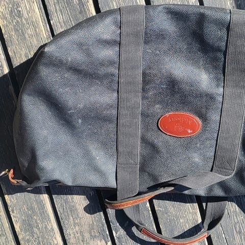 Selger et klassisk Mulberry reise sett bestående av en stor weekend bag, en romslig toalettmappe og en mindre pouch. Alt er originalt Mulberry med preget skinnlook, messingspenner og karakteristiske skinnkanter. Dette ble kjøpt nytt for cirka femten år siden, og jeg er eneste eier. Settet har kun vært brukt ved reiser, og alltid oppbevart tørt og røykfritt.