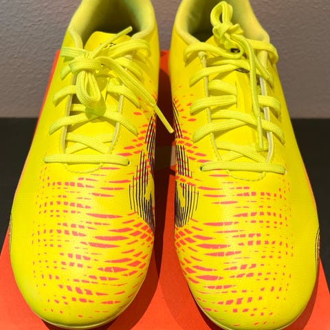 Puma Ultra Play MG Jr fotballsko i oransje farge. Skoene er designet for junior og har en størrelse 38,5 (EU) / 5,5 (UK) / 24,5 cm. Materialet og designet er egnet for bruk på flere underlag med multifunksjonelle knotter.