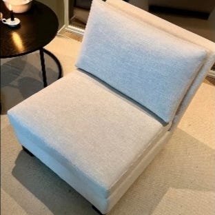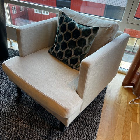 To grå lenestoler fra Slettvoll i stoff, med rund puff i matchende farge og materiale (ikke samme merke, og litt annen farge). Lenestolene har en pute for ekstra komfort og ben i mørkt tre.