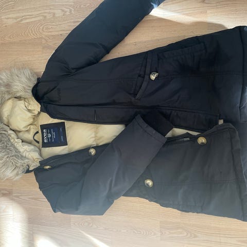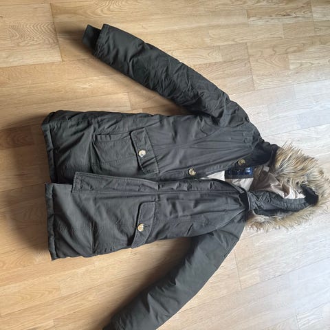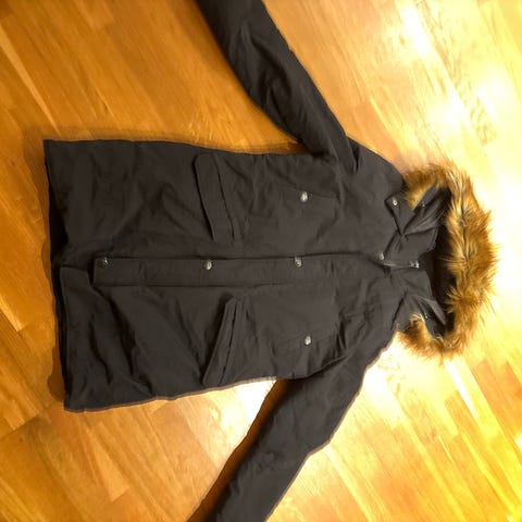 Den er pent brukt, og har ingen hull eller merker som jeg har sett. Selges da datteren ikke bruker den lenger og vil ha seg ny jakke.