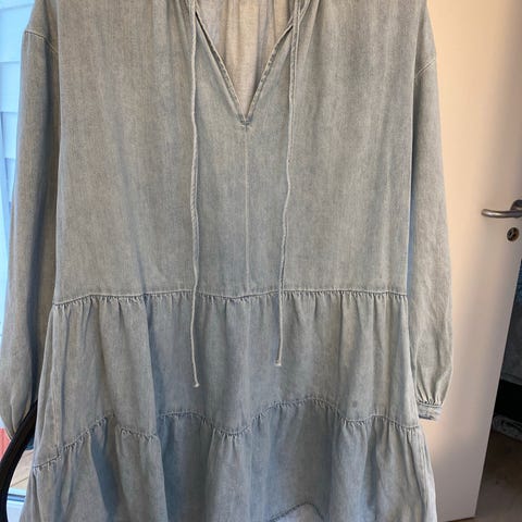 Marie Philippe Sommerkjole i størrelse L, blå farge. Kjolen har lange ermer med mansjetter, v-hals med knyttedetaljer og voluminøs, lagdelt design. Linkjole som egner seg til sommerbruk.