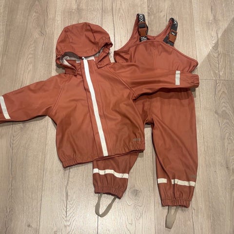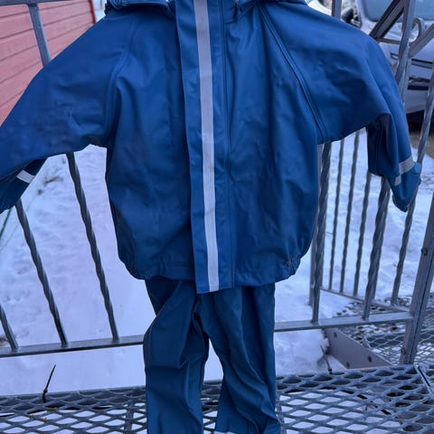 Selger regnsett fra Reflex. Strikkene på skuldrene på buksene er litt nuppete, og de har en liten ripe på det ene kneet, men de er fortsatt vanntette. Ingen flekker eller misfarging.