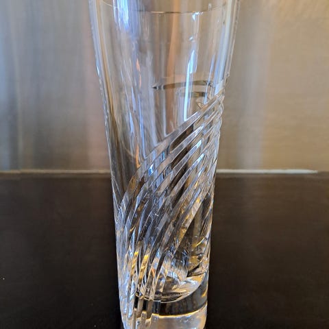 Hadeland Glassverk vase i klart glass med gravert uglemotiv. Vasen har et dekorativt design med detaljer i glasset som viser en ugle.