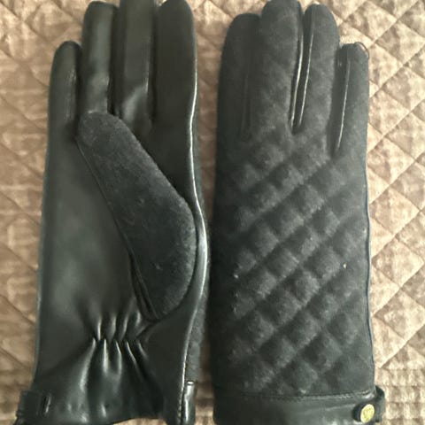 Skinnhansker i svart farge. Hanskene er laget i skinnmateriale og har en glatt overflate. Fikk disse i gave, står ikke hvilken størrelse, men jeg tror det er mellom xs/s. Hanskene leveres i en eske, men ikke originale esken. Usikker på om hanskene er helt nye, da de kom i en annen eske.