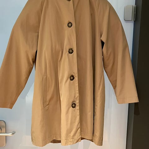 Flott høstjakke i bommullspoplin str L. Merke Staff. Skjulte knapper. A fasong. Fargen på bilde 2 er mest riktig. Lengde rygg 66 cm. Veldig aktuell farge. Selger også skjørt i fra Filippa K i matchende farge str s i ullblanding. Lengde 83
