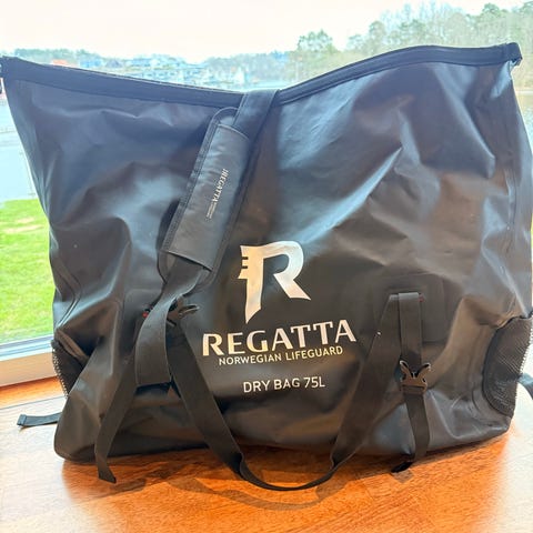 Den har noen flekker på bag etter å ha ligget på dekk og den har tape en plass hvor sømmen på baggen har et hull.