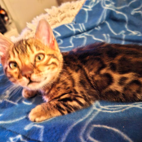 Kattungene er fortsatt i 'påfase, dette er en helt naturlig utviklingsfase for bengal-katter der pelsens endelige mønster og fargekontrast gradvis viser seg. De vil bli enda finere med tydeligere tegninger etter hvert som de vokser.