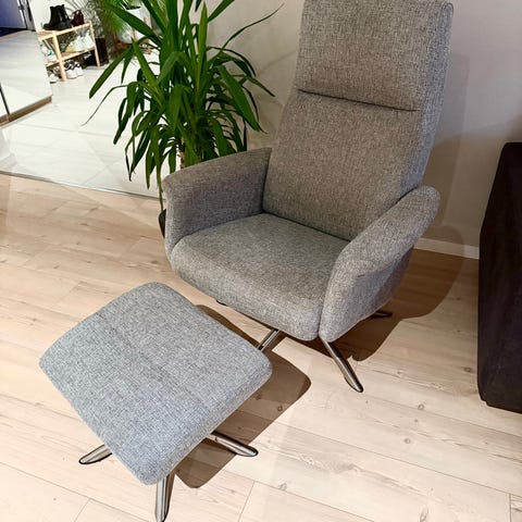 Stolen har aldri vært i bruk, kun stått i et gjesterom. Stol og puff ble kjøpt ny i fjor høst. Da kostet de samlet over 13 000. Selges billig da jeg ikke har plass til de.
