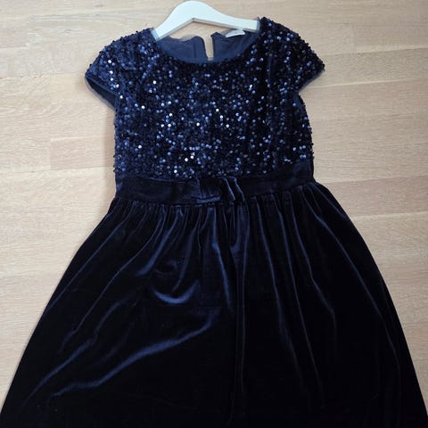 Pent brukt mørkeblå velurkjole i str 110/116 150,-