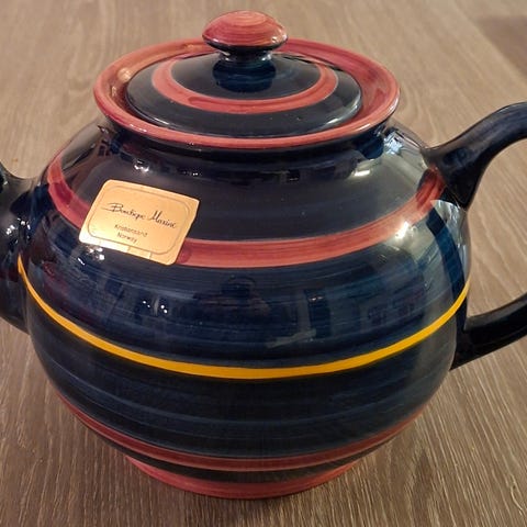 Selger tekanne og ti små krus med det såkalte løk mønsteret. Det følger også med to små blomsterpotter og et ekstra lokk til tekanna.