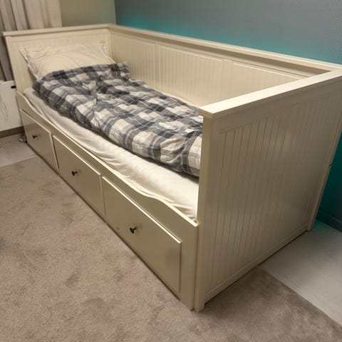 Sengeramme med oppbevaring inkl sengebunn. Madrassmål 90x200, så senga sitt totale mål (dybde/lengde) er noe lenger enn dette. Den har synlige merker etter bruk. Madrass følger ikke med.