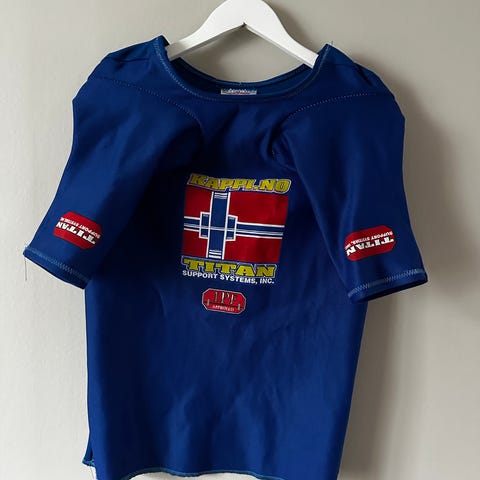 Benkpresskjorte fra Titan / Kappi. Brukt til konkurranser for flere år siden, og ikke brukt siden. Den har noen bruksmerker, men er i fortsatt god stand. Nypris i dag er drøyt 3000kr. Kan hentes hos