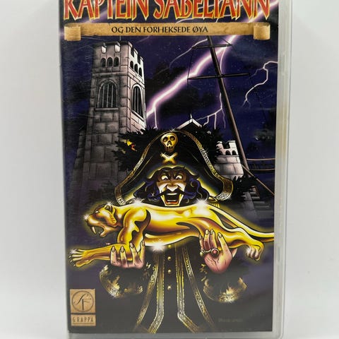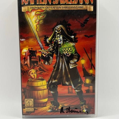 Kaptein Sabeltann VHS kassett med filmen "Drømmen om Kaptein Sabeltanns Rike". Inneholder eventyr med Kaptein Sabeltann og hans mannskap, inkludert scener med pirater, skip og skumle motstandere. Passer for barn og samlere av norske barnefilmer på VHS-format.