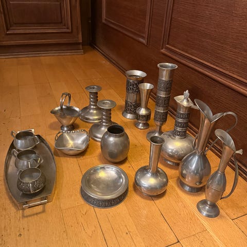 Konge Tinn Norwegian Pewter gaffel og kniv sett laget av metall Settet består av en gaffel og en kniv med dekorative håndtak. Produktet er produsert i Norge og har detaljert design på håndtakene. Passer til bruk ved servering av kjøtt eller lignende retter.