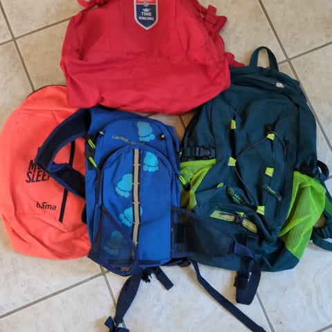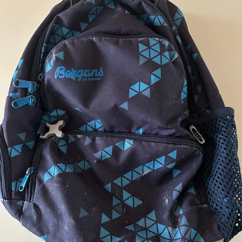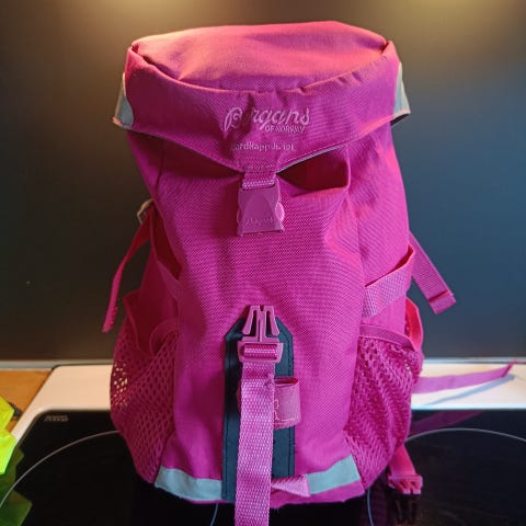 Bergans barneryggsekk i fire forskjellige farger: lilla, rosa, svart og blå med mønster. Sekkene har flere lommer, justerbare stropper og nettinglommer på sidene. Egnet for barn og tilpasset mindre ryggstørrelser. Passer godt for bruk i barnehage eller tur. Den blå sekken har liten skade på låsen, men sekken er fortsatt brukbar. 3 sekker som er igjen. Selges samlet for 250 kr, eller enkeltvis for 80,-. Kan hentes på Skjetten.
