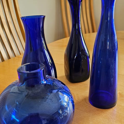 Tre såkalte svibel- eller løkvaser. Den til venstre er i koboltblått glass merket Hadeland 1969 under. Ingen skader eller merker på noen av dem. Pene og blanke. Selges samlet 250 kr. Kan sende med PostNord til 69 kr. Pakker godt eske med polstring.