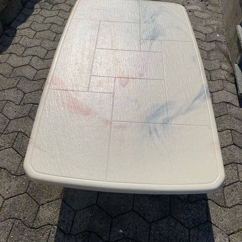 Litt merker i steinen men det synes så og si ikke, da må du nesten studere bordet godt med lupe i riktig lys og vinkel.