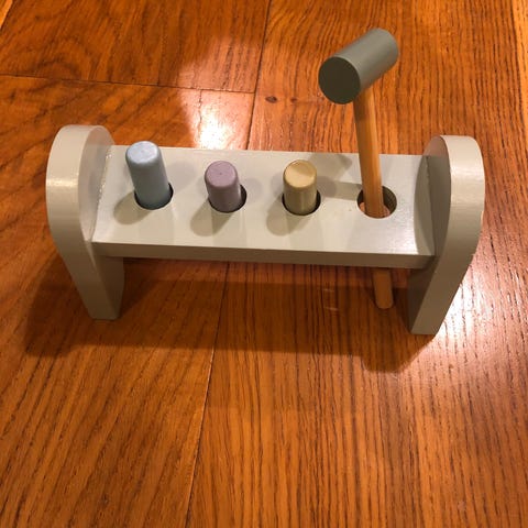Vintage Baby Björn Hengende Barneleketøy laget av tre og plast. Designet for å henge på seng eller lignende, med fargerike elementer i rød, gul, grønn og svart. Passer for små barn som utvikler motoriske ferdigheter.