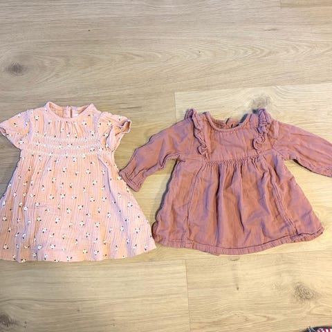 KappAhl Rosa og rød kjole i størrelse 62. Kjolene har et lagdelt tyllskjørt, en med lange og en med korte ermer. Det følger med en ekstra kjole og strømpebukse på kjøpet. Kjolene er kun brukt og vasket 1 gang.