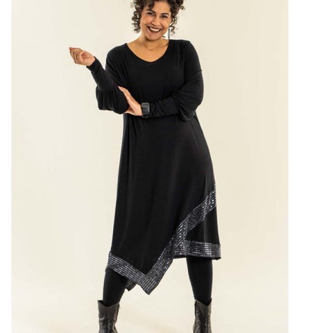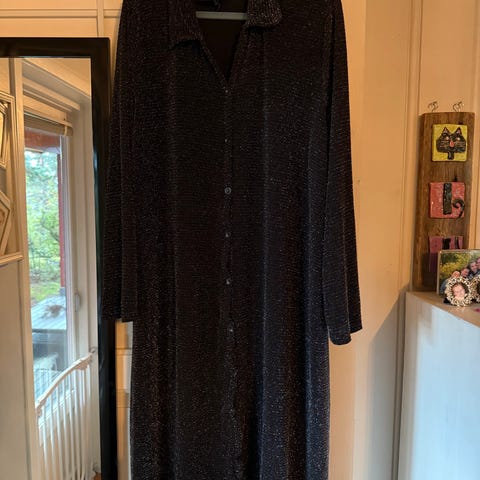 Supermoderne kjole til jul/nyttår til veldig lav pris. ONLY Studio festkjole i svart med glitter, størrelse XL. Kjolen er langermet med knyting i midjen, laget i et materiale med glitrende effekt.