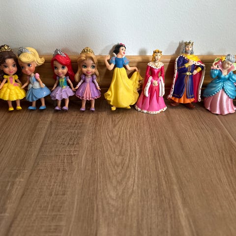 Disney dukker med forskjellige klær. Den ene dukken har blått og hvitt antrekk med isdanssko og hatt med snømannmotiv. Den andre dukken har flerfarget skjørt og hvit t-skjorte med enhjørningmotiv. -ca 100 cm . Dukkenes materiale er plast og tekstil, egnet for barn.