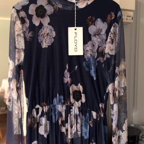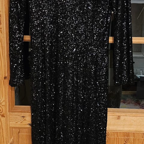 Make a Wish festkjole i størrelse 44 for kvinner. Kjolen er svart med detaljer i et mønstret "tyll"stoff på ermene. Materialet kombinerer glatt stoff med mønstret tekstur, og ermene har knappedetaljer ved mansjettene. Passer til formelle anledninger.