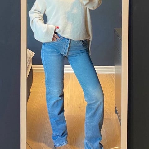 Jeansene har knappelukking og klassisk fem-lommers design. Dette er en eldre modell men klarer ikke helt sikkert å si hvilken modell da det har gått bort. Muligens 501.