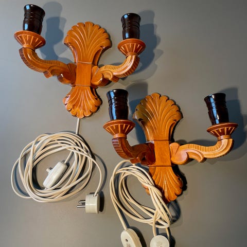 Lampettene er et sett som har felles ledning og stikk kontakt. De er fra tidlig på 1960 tallet. Fungerer som ny. Pære som hører til er med tykk sokkel. Selges uten lampeskjerm.