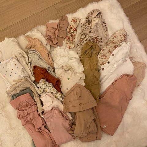 Selger en søt og praktisk klespakke i størrelse 50, perfekt til nyfødt. Klærne er pent brukt, noen plagg er helt nye og ubrukt. De fleste plaggene er i nøytrale farger, men noen få er kjøpt til jentebaby.