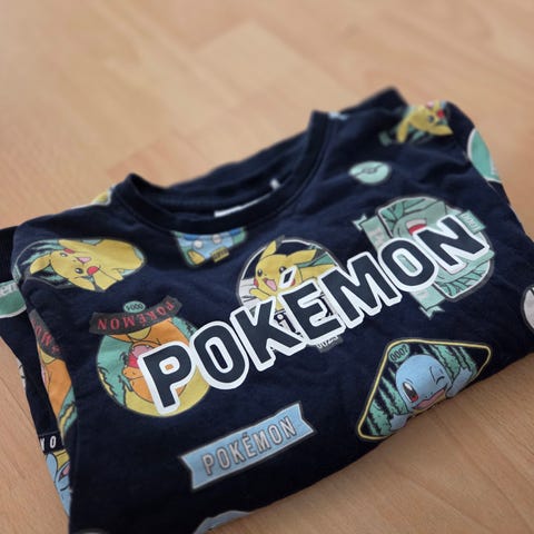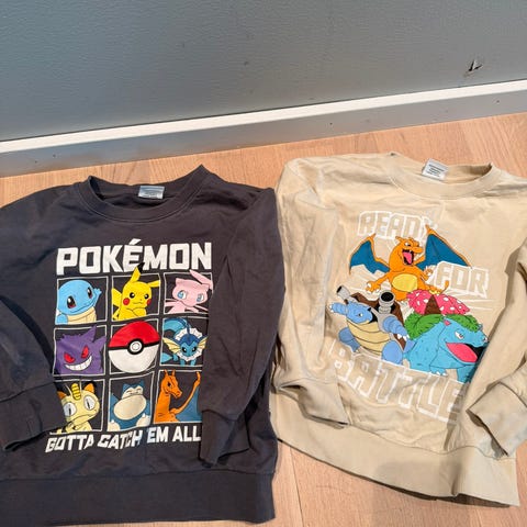 En pokemongenser fra Lindex, str 134. En basic genser frq KappAhl str 122/128. De er like store når de ligger oppå hverandre.