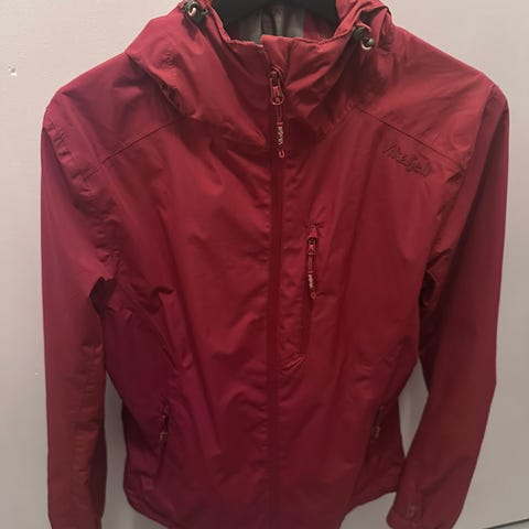 Heldre skall jakke størrelse 38 (tilsvarende M for kvinner). Jakken er laget for å gi beskyttelse mot regn og har hette. Materialet er vanntett og pustende, egnet for utendørs bruk i vått vær. Jakken har glidelåslommer med mesh-ventilasjon og justerbare mansjetter.
