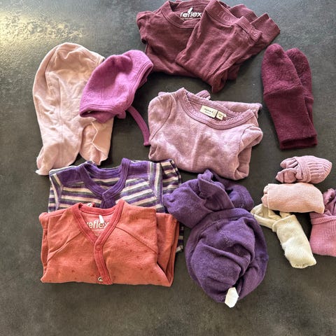 Pakke fra Nøstebarn med mange ulike deler, brukt til barn ca str 74-86. En selvstdd genser med nøsterbarn-stoff. To fine ullfleece-luer. Ny verdi er flere tusen. Noen anmerkninger, se bilder .