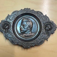 Dekorativ vintage fødselsplakett (barnetavle) i metall, med plass til barnets bilde, navn, fødselsdato, klokkeslett, vekt og lengde.