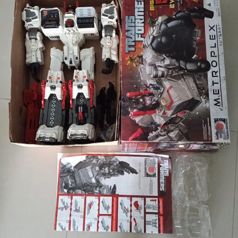 Transformers metroplex med flere tilbehørsdeler inkludert våpen og ekstra komponenter. Figuren er i original emballasje som har noe slitasje og leveres med instruksjonsmanualer. Passer for samlere og fans av Transformers-serien.