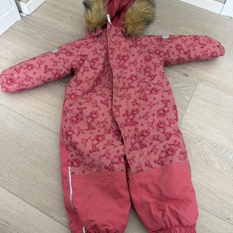 Reflex barnedress for jente i størrelse 74. Dressen er rosa med mørkere rosa detaljer og har hette med pelskant. Egnet for bruk i kaldt vær og utendørsaktiviteter.