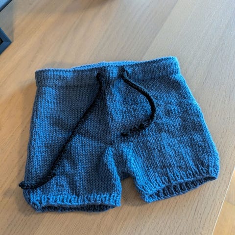 Hjemmestrikket shorts. Tøyelig og kan vokse med barnet. Strikket forhøyning bak for bedre komfort. Garnet er blanding mellom merinoull og bomull. Jeg garanterer ikke for småfeil i strikketøyet. Se bilder av centimeter mål for å avgjøre størrelsen selv.