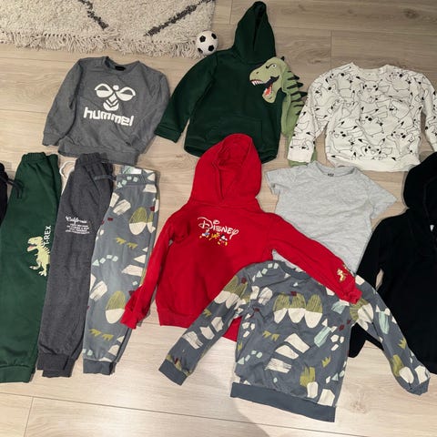 H&M, Nameit, Dyreparken, Play Tec , barneklær pakke som inneholder flere plagg i størrelse 122. Klærne er flerfarget og egnet for både gutter og jenter (unisex). Materialene inkluderer økologisk bomull og fleece, med ulike typer bukser og topper. Plaggene har praktiske detaljer som elastiske midjebånd og forsterkninger på knærne.