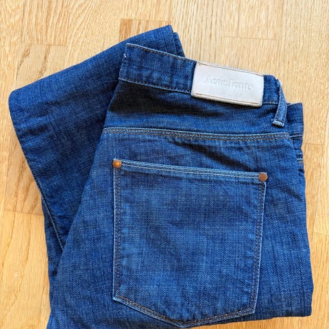 En mørk blå Lee, i modellen Luke, størrelse 30x34 (mye stretch, jeg bruker vanligvis 31 eller 32 i livet). Denne er slim i passformen.
