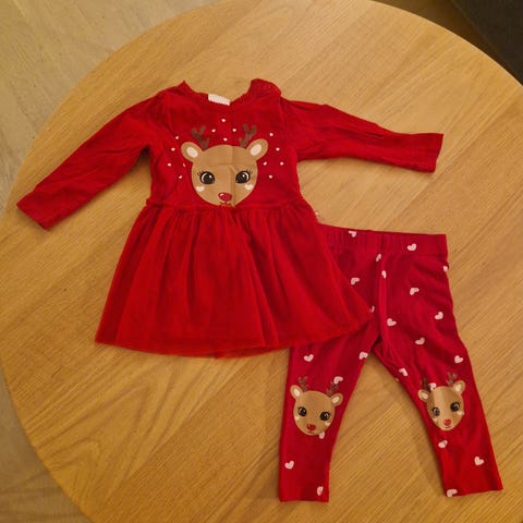 KappAhl barneklær sett i blå farge, størrelse 74, designet for jente. Sett består av vest og bukse med mønsterdetaljer og røde bånd. Materialet gir komfort og egner seg til daglig bruk.