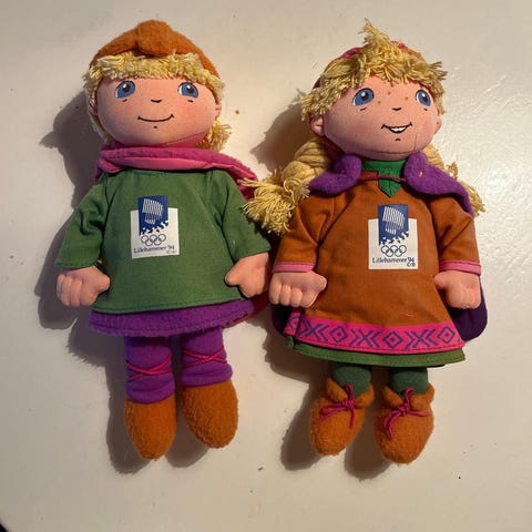 Pent sett med Kristin og Haakon-maskoter fra OL 1994 på Lillehammer til salgs. Dette er modellen som er 39 cm høy.