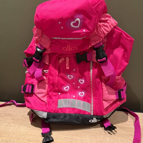 Skolesekk fra Bäckmann selges. Noen bruksmerker og noen av merkene på sekken er slitt, men det påvirker ikke bruken. Sekken er nyvasket. Eget feste til husnøkkel og regntrekk følger med.
