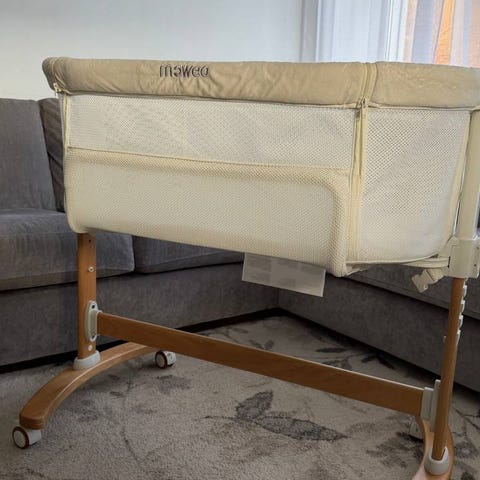 Moweo Bedside Crib i grå farge. Laget for bruk som en barnebed ved siden av voksen seng. Passer for små barn og nyfødte. Laget med pustende materialer og nettingvinduer for ventilasjon og oversikt. Justerbar høyde og stabil ramme for sikkerhet og komfort.