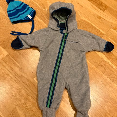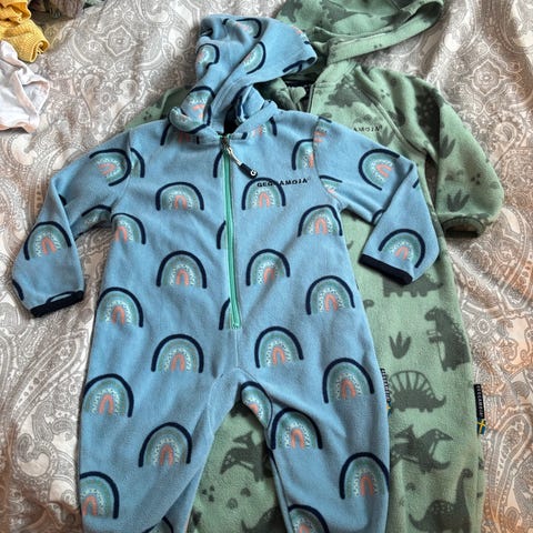 Geggamoja fleecedress i størrelse 74. Unisex design med hette, glidelås foran. Avtagbar hette med trykknapper. Stoffet er grønt med vaskebjørner. Størrelse 74/80. Normal i størrelsen. Pent brukt. Nypris 499,-. Kjøpt ny i 2025.