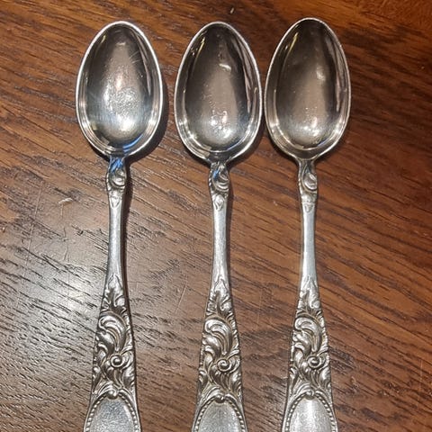 Pent brukte serverings deler I mønster Rococco. Stemplet NM 60 bak på skaftet. 6 deler. 1 spade med på kjøpet. Til høyre på bildet. Ikke helt likt mønster. Se også beskrivelse ved bildene. Selges samlet for 250 kroner. Kan hentes I Drammen eller sendes I posten