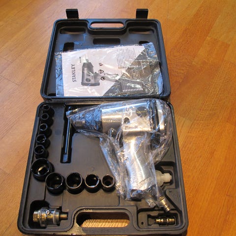 Stanley Luftdrevet Muttertrekker med 10 mm piper, leveres i koffert med flere piper. Verktøyet er beregnet for bruk med trykkluft og egnet for montering og demontering av muttere og bolter.