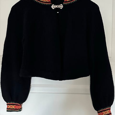 Strikket helt ny bunadsjakke str 122 ( 6-7 år) kr 1000. Denne er til en Vestfoldbunad, eller om man vil ha den til en festdrakt som på bildet så er det også blitt normalen. Jakken måler 35 cm i bredde nederst i jakke borden, altså fra ene sømmen til den andre. Ermet måler fra under armhulen der sømmen begynner til ermet: 35 cm der også.