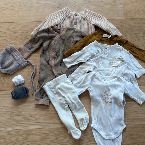 Klespakke 50-56 nyfødt / nøytrale farger / bodyer / strømpebukse / bukser/luer